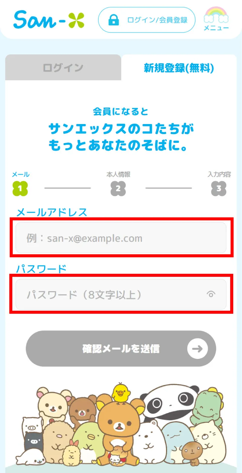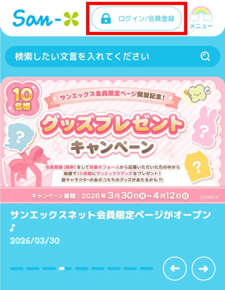 ※サンエックスネット右上の「ログイン/会員登録」ボタンからもアクセスできます。 (すでに登録・ログイン済みの場合は「マイページ」と表示されます)