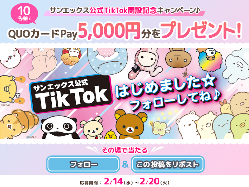 サンエックス公式TikTokアカウント開設!!公式XではQUOカードPayが当たるキャンペーンも実施♪