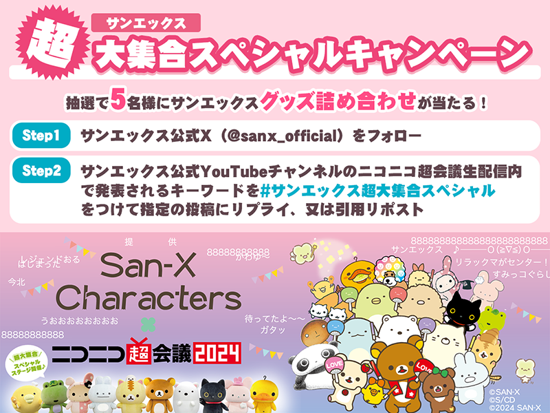 step2. サンエックス公式YouTubeチャンネルで生配信の 【ニコニコ超会議】サンエックス~超大集合スペシャル~ 内で発表されるキーワードを #サンエックス超大集合スペシャル をつけて指定の投稿にリプライ、又は引用リポスト