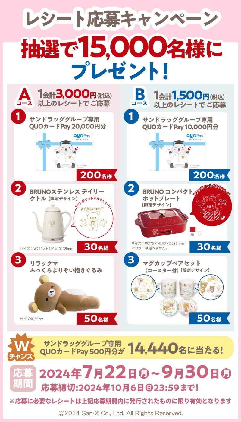 ご応募頂いた方の中から抽選で合計15,000名様にサンドラッググループでご利用いただけるQUOカードPayやリラックマグッズが当たります!