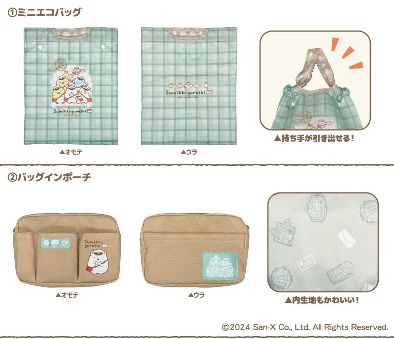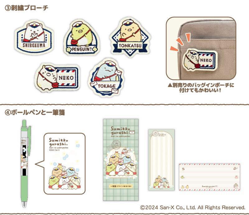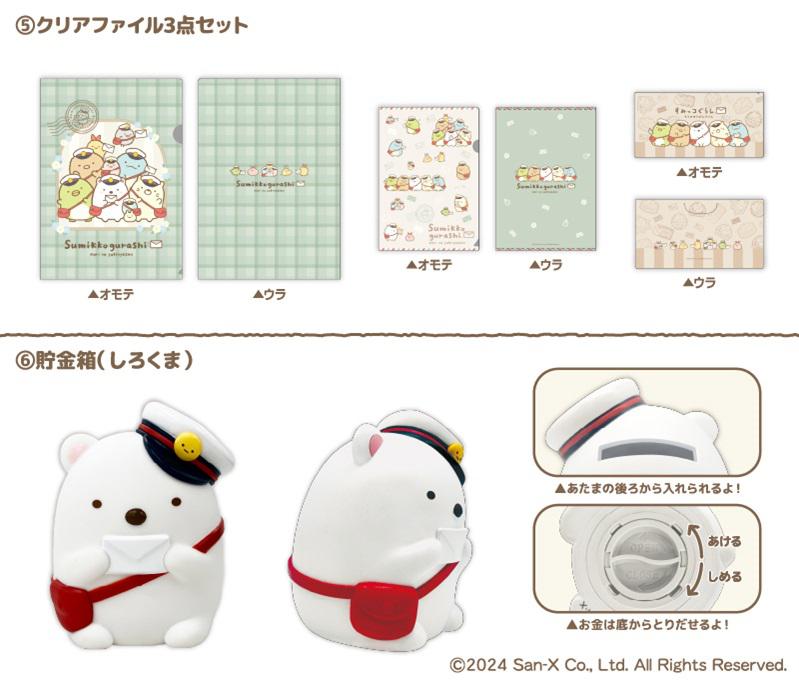 普段使いしやすい「ミニエコバッグ」や「バッグインポーチ」をはじめ、学校でもオフィスでも使える「ボールペンと一筆箋」、書類の整理に便利な「クリアファイル3点セット」、お手持ちのバッグやポーチに付けるとかわいい「刺繍ブローチ」、さらにお手紙を持った姿が癒される「貯金箱(しろくま)」の計6種のグッズです。