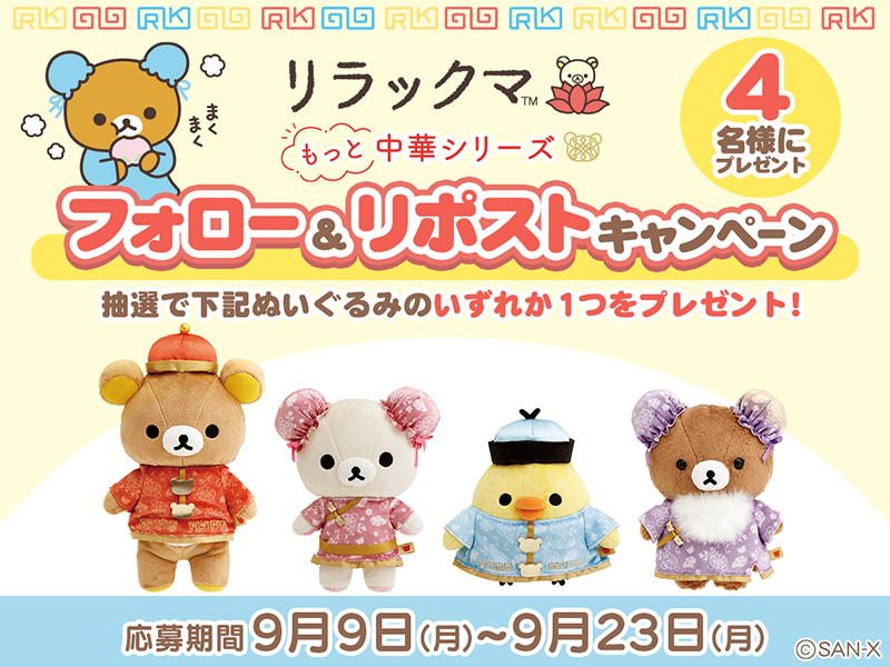 『リラックマのもっと中華シリーズのぬいぐるみ発売記念☆リラックマごゆるりサイト公式X(旧Twitter)フォロー&リポストキャンペーン』
