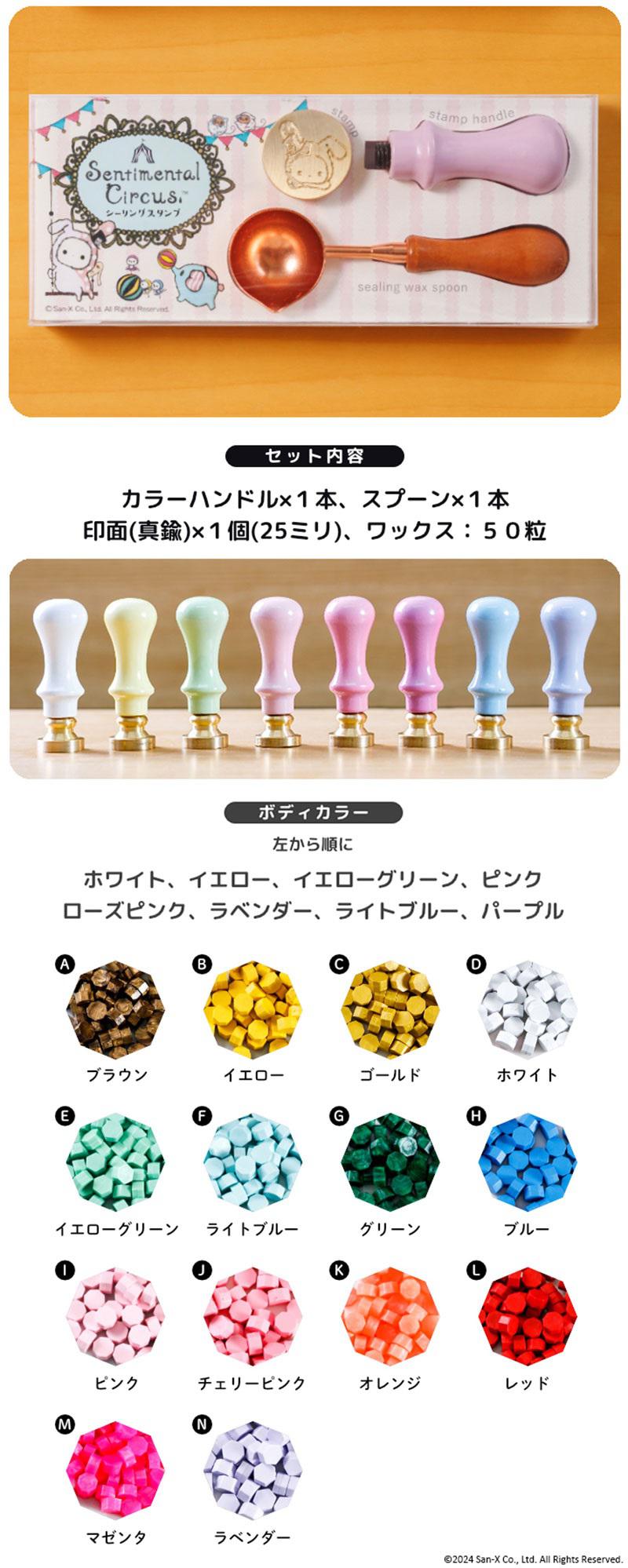 セットには、直径25ミリのシーリングスタンプの印面、8色から選べるかわいいハンドルが各1個。さらに14色から選べるワックスが50粒、ワックスを熱するためのスプーンが付属します。