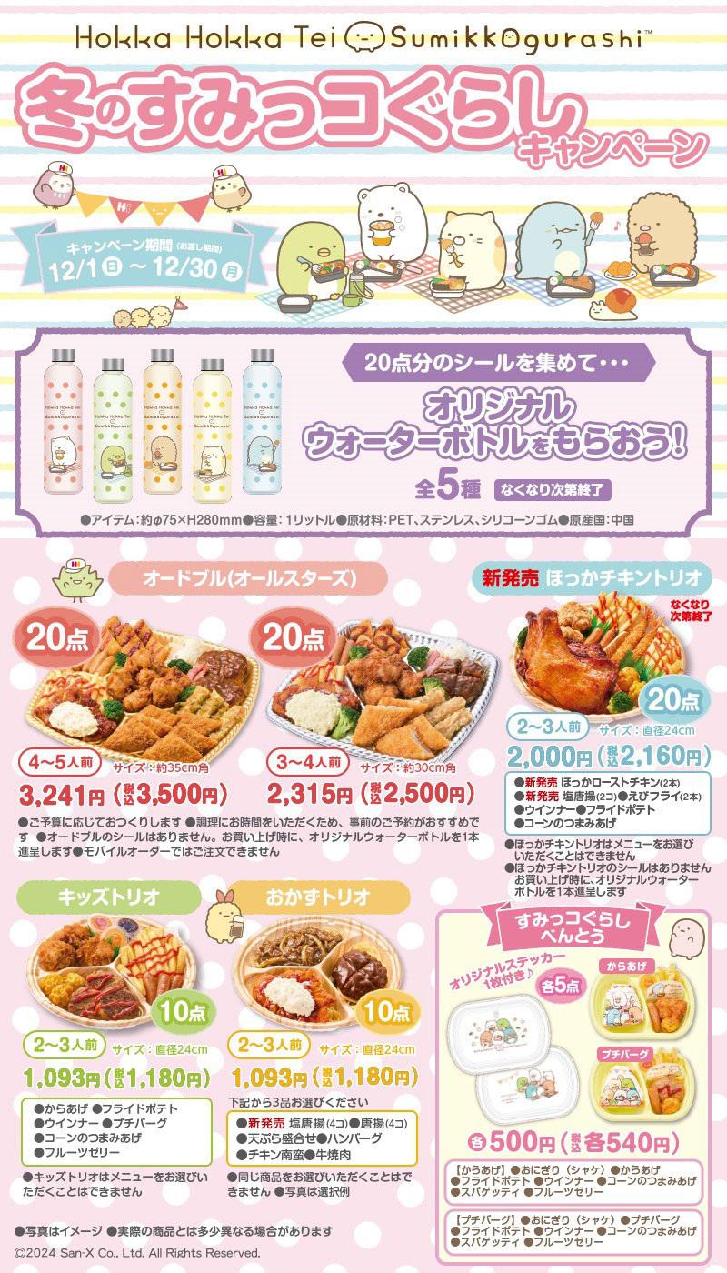 ほっかほっか亭のすみっコぐらしべんとうはじめ、各種オードブルや、ほっかチキントリオ、キッズトリオ、おかずトリオなどの対象商品をご購入いただき、シールを20点分集めていただいた方に