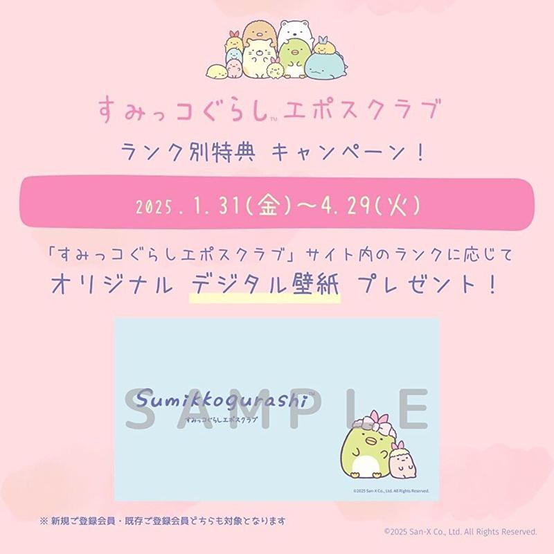 エポスカード会員さまならどなたでも無料でご登録いただける「すみっコぐらしエポスクラブ」にて、サイト内のランク別にオリジナルGIF壁紙(スマートフォン用・PC用)をプレゼント♪