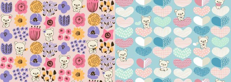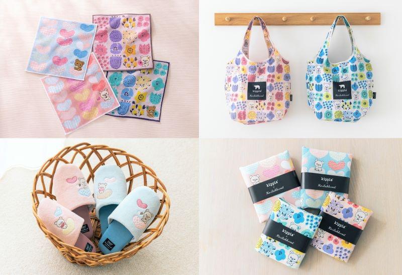 コリラックマとチャイロイコグマが、キッピスのテキスタイルデザインKesakuu(左)とSydan(右)の中に入ったコラボ限定柄をあしらった4種の商品も注目です。