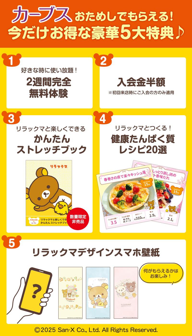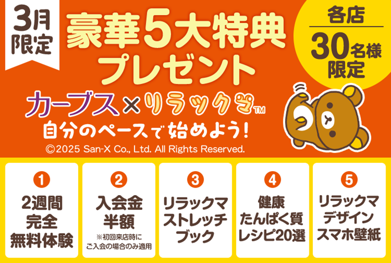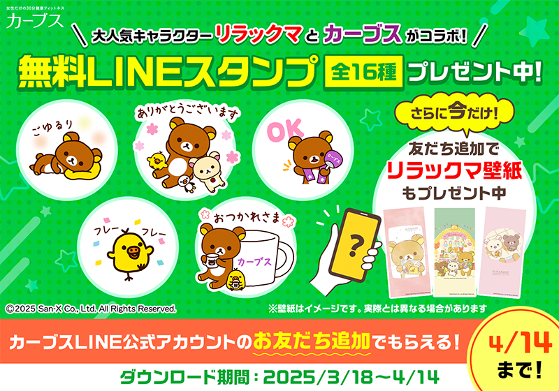 リラックマと「女性だけの30分健康フィットネス カーブス」のコラボスタンプを、2025年3月18日(火)11時から期間限定で無料プレゼント中です♪
