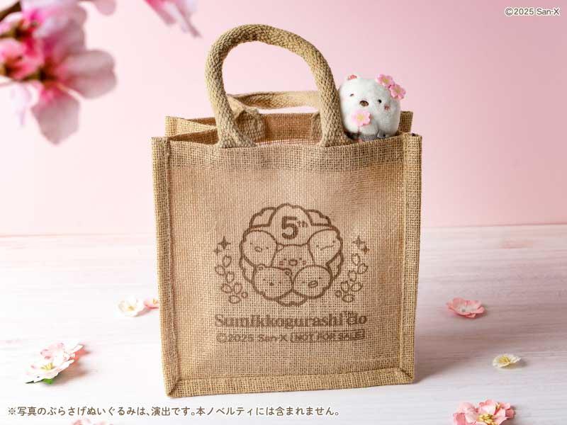 すみっコぐらし堂5周年記念ロゴをあしらった、特別なジュートバッグです。