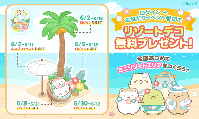 ログイン&おねだりイベントに参加すると、無料デコがもらえるチャンス♪全部あつめて、ミニリゾートエリアを完成させよう!