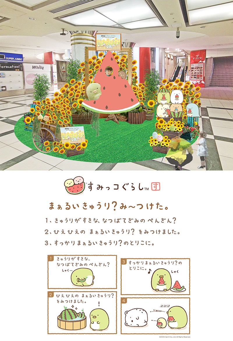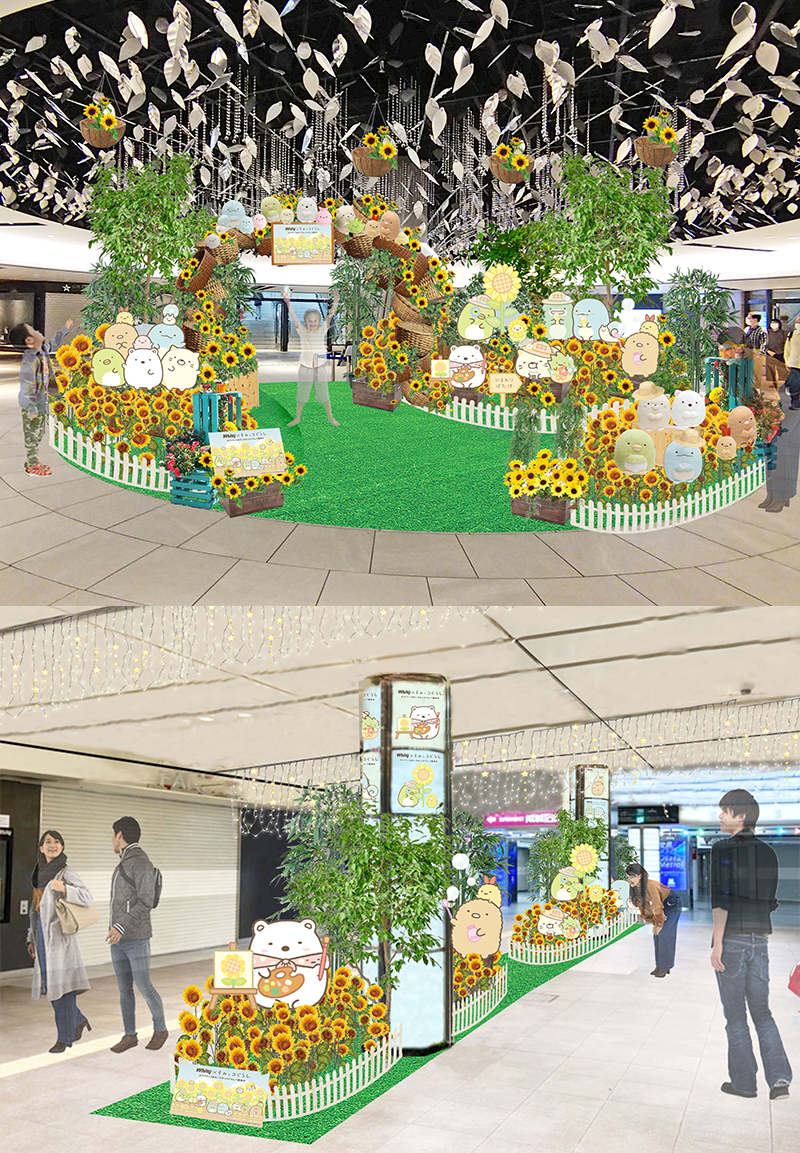 本装飾では、ホワイティうめだ内の「泉の広場」「サニーテラス」「FARURU間通路」などに「すみっコぐらし」と夏を代表するお花「ひまわり」が広場を彩ります!