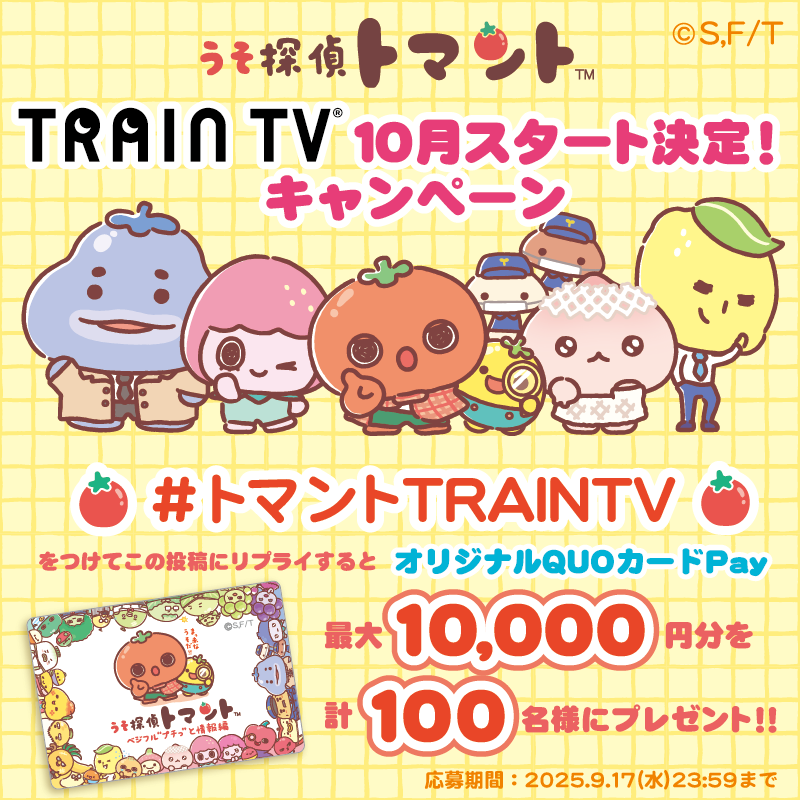 うそ探偵トマント公式Xアカウントをフォロー&指定の投稿に「#トマントTRAINTV」をつけてリプライすると、限定デザインのQUOカードPay最大10000円分が計100名様に当たります!