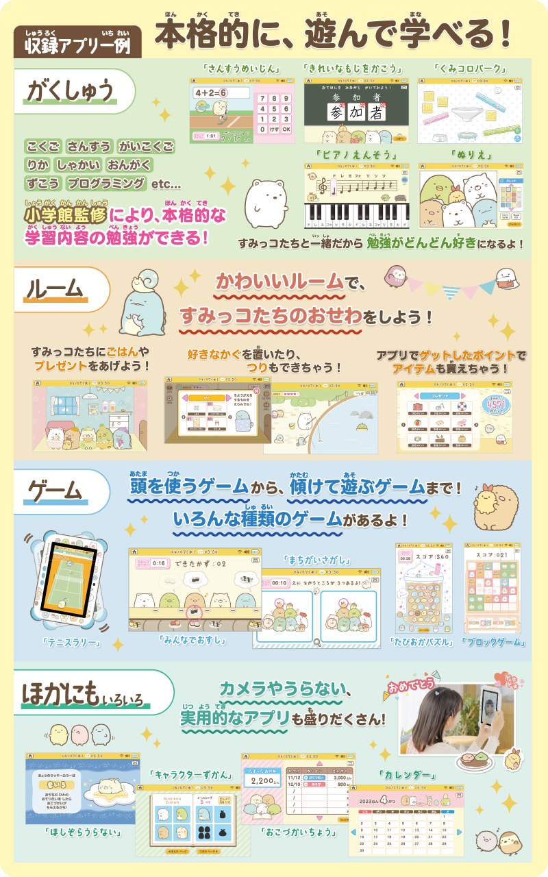 小学館監修の幅広い教科の学習問題と、すみっコたちのお世話ができるルームアプリ、いろんな種類のゲームアプリなどがたくさん入っているので、いつでもどこでも楽しめます♪