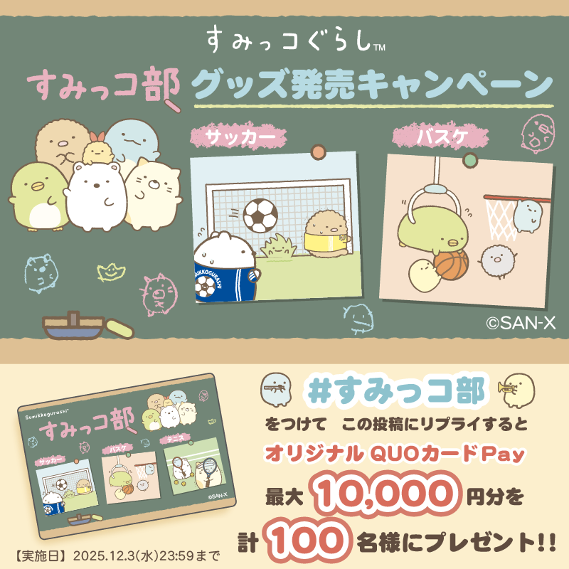 すみっコぐらし公式Xアカウントをフォロー&対象ポストに「#すみっコ部」をつけてリプライすると「限定デザインのQUOカードPay最大10,000円分」が抽選で100名様に当たるキャンペーン♪