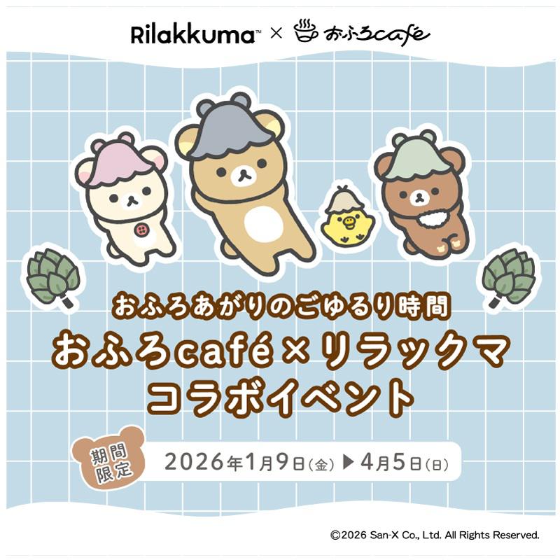「おふろcafe」の全国13店舗にて、2026年1月9日(金)~4月5日(日)の期間中、昨年大好評だったリラックマ × おふろcafe のコラボイベントをさらにパワーアップした「おふろあがりのごゆるりタイム 2026」を開催します!