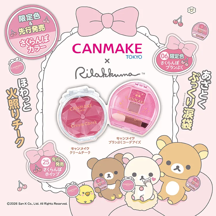 ※ノベルティのプレゼントは、一部店舗での実施となります。 ※店舗により、お渡しするノベルティの種類が異なる場合があります。 ※ノベルティは数に限りがあり、なくなり次第終了となります。 ※キャンメイク商品本体に、リラックマなどのキャラクターのプリントは施されていません。 ※ノベルティの配布情報はキャンメイク公式Xにて随時配信していきますのでご確認ください。 キャンメイク公式X:https://x.com/CanmakeTokyo