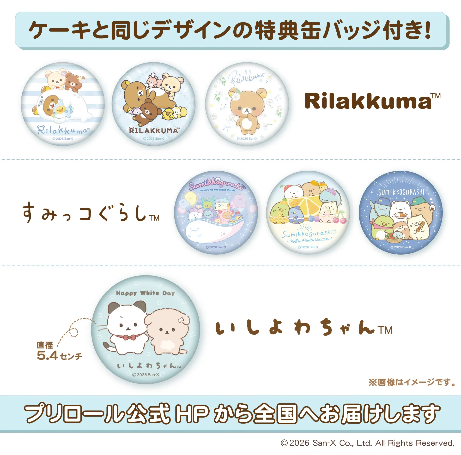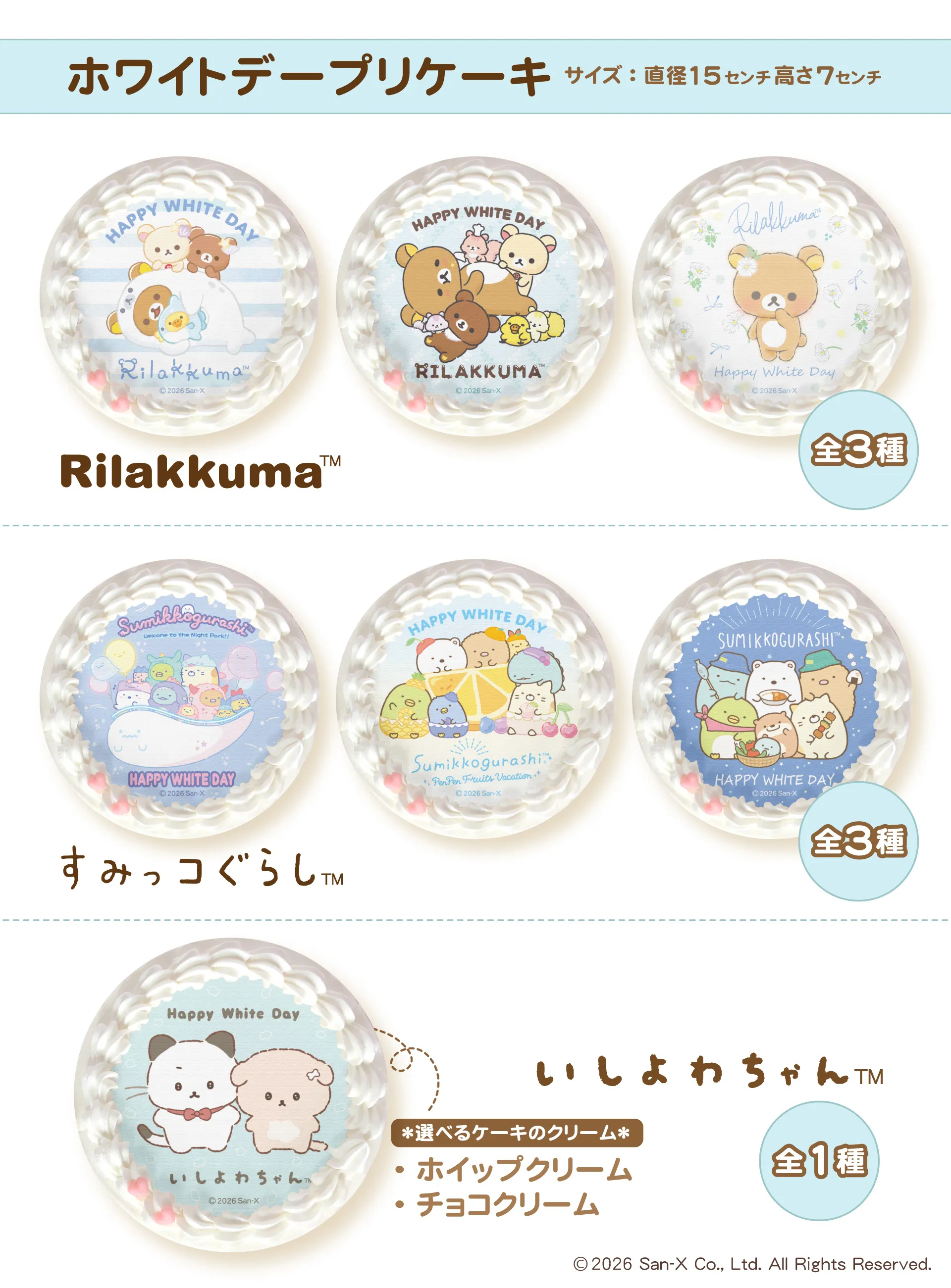 商品名:ホワイデープリケーキ2026 価格:各5,130円(税込・クール便送料別) 種類:リラックマ 全3種/すみっコぐらし 全3種/いしよわちゃん 全1種