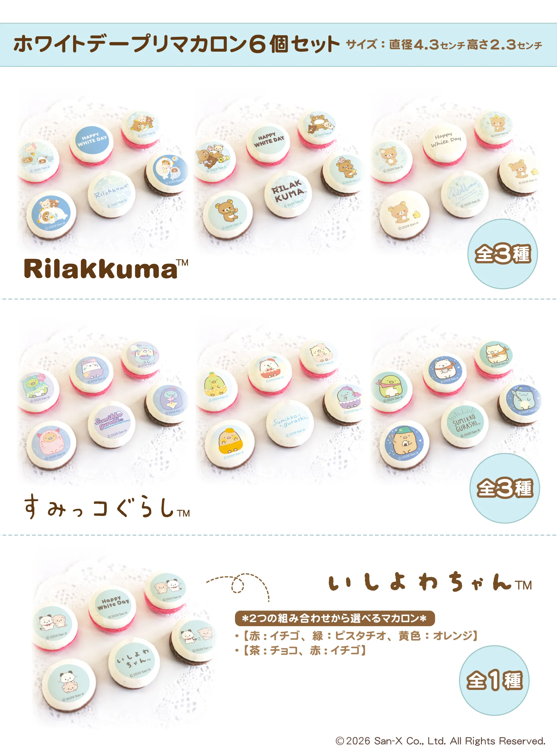 商品名:ホワイトデープリマカロン6個セット2026 価格:各2,754円(税込・クール便送料別) 種類:リラックマ 全3種/すみっコぐらし 全3種/いしよわちゃん 全1種