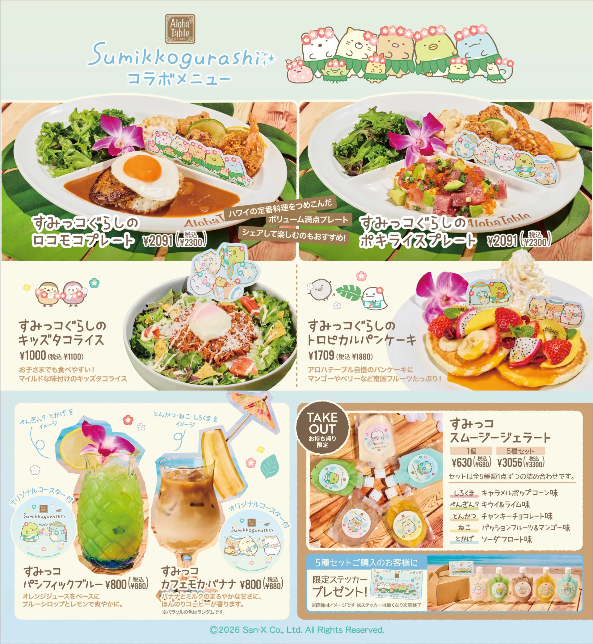 今回のコラボレーションでは、すみっコたちがリゾート風衣装で皆さまをお迎えします。 ロコフードやトロピカルなスイーツを囲みながら、すみっコたちと一緒にのんびりお過ごしください。