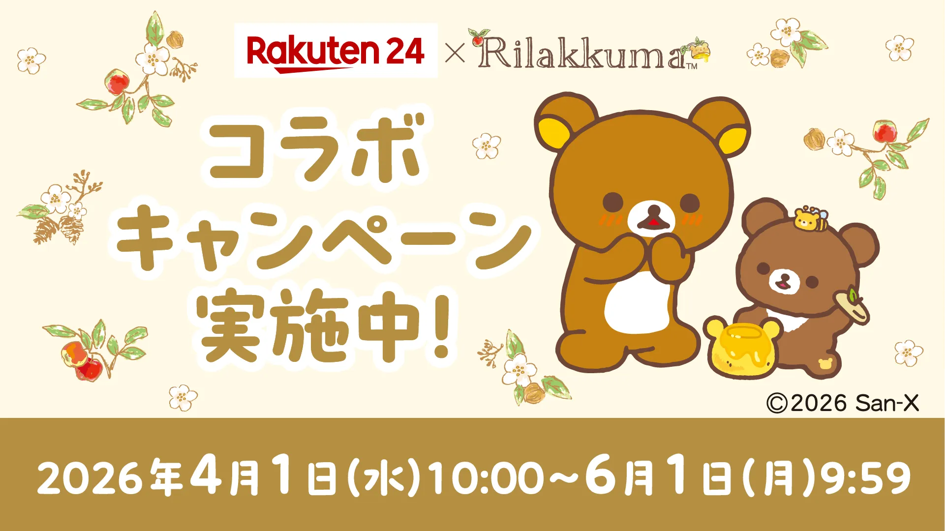 生活に必要なあらゆるものがお得に買える『楽天24グループ店』と『リラックマ』のコラボキャンペーンがスタート! はちみつの森ではちみつを収穫するかわいいリラックマたちのオリジナルグッズを抽選でプレゼント!