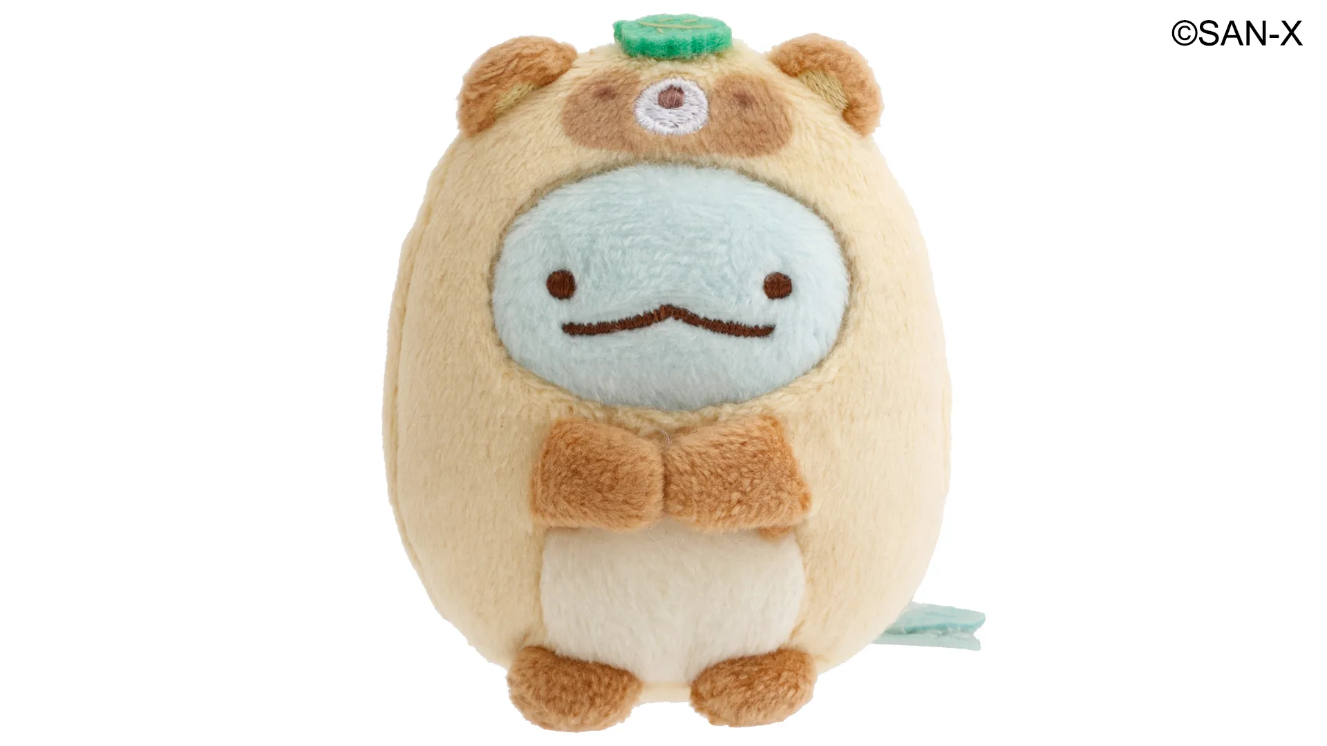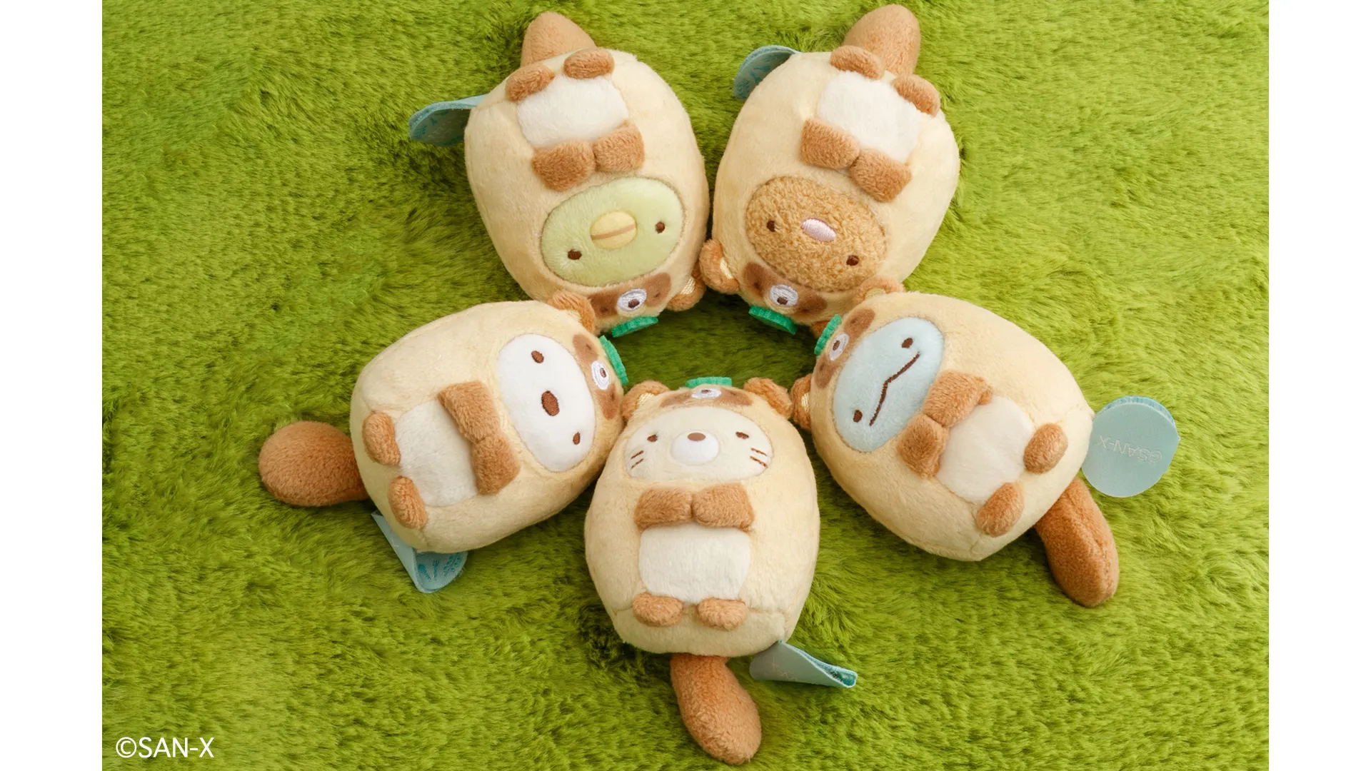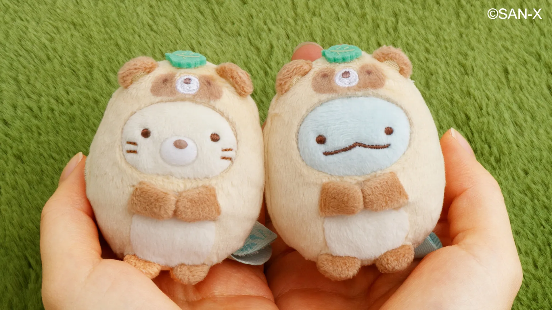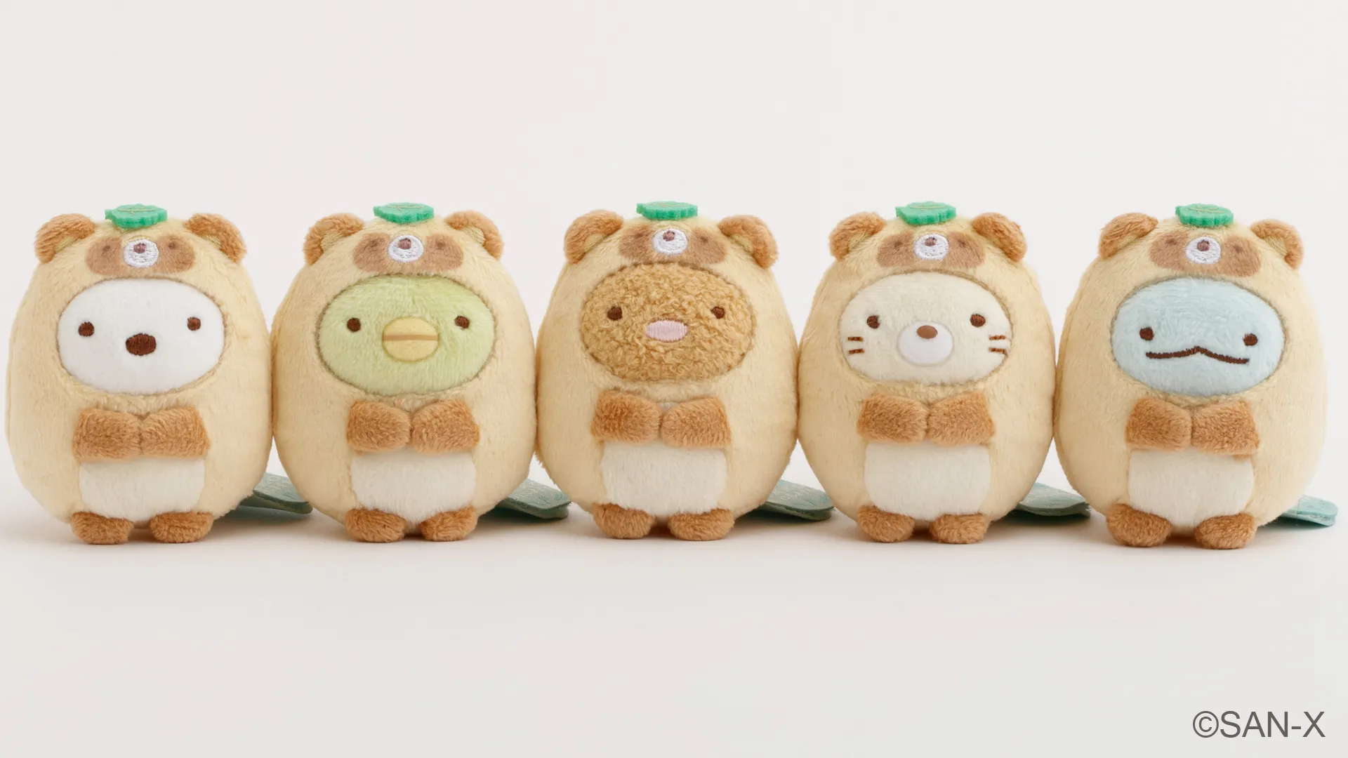 おそろでたぬきになりきったすみっコたち。 頭にちょこんと乗ったグリーンの葉っぱがポイントです。