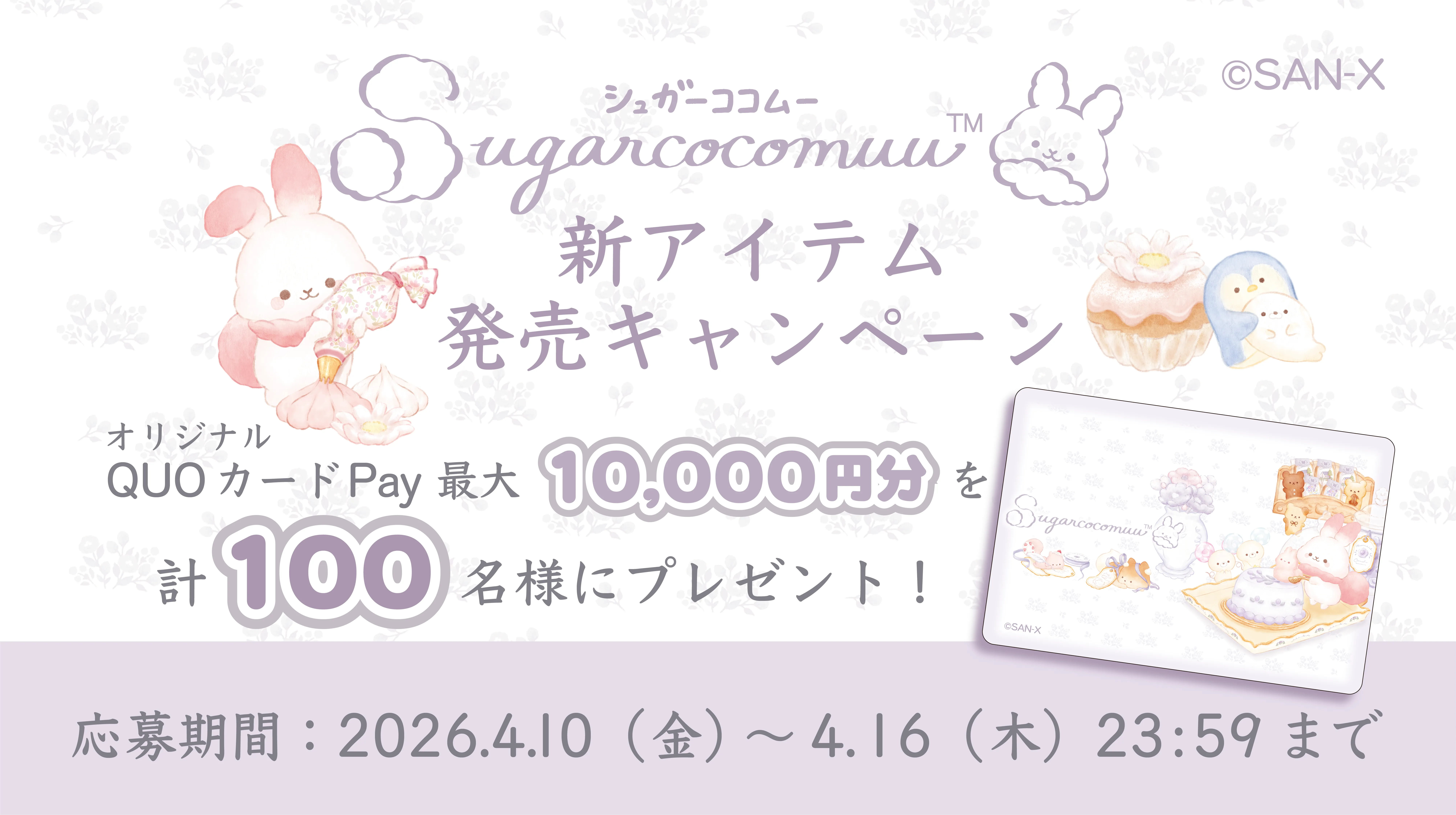 応募期間:2026年4月10日(金)~4月16日(木)23:59 参加方法:シュガーココムー公式Xをフォロー&キャンペーン投稿をリポスト プレゼント:オリジナルQUOカードPay最大10,000円分を計100名様にプレゼント!