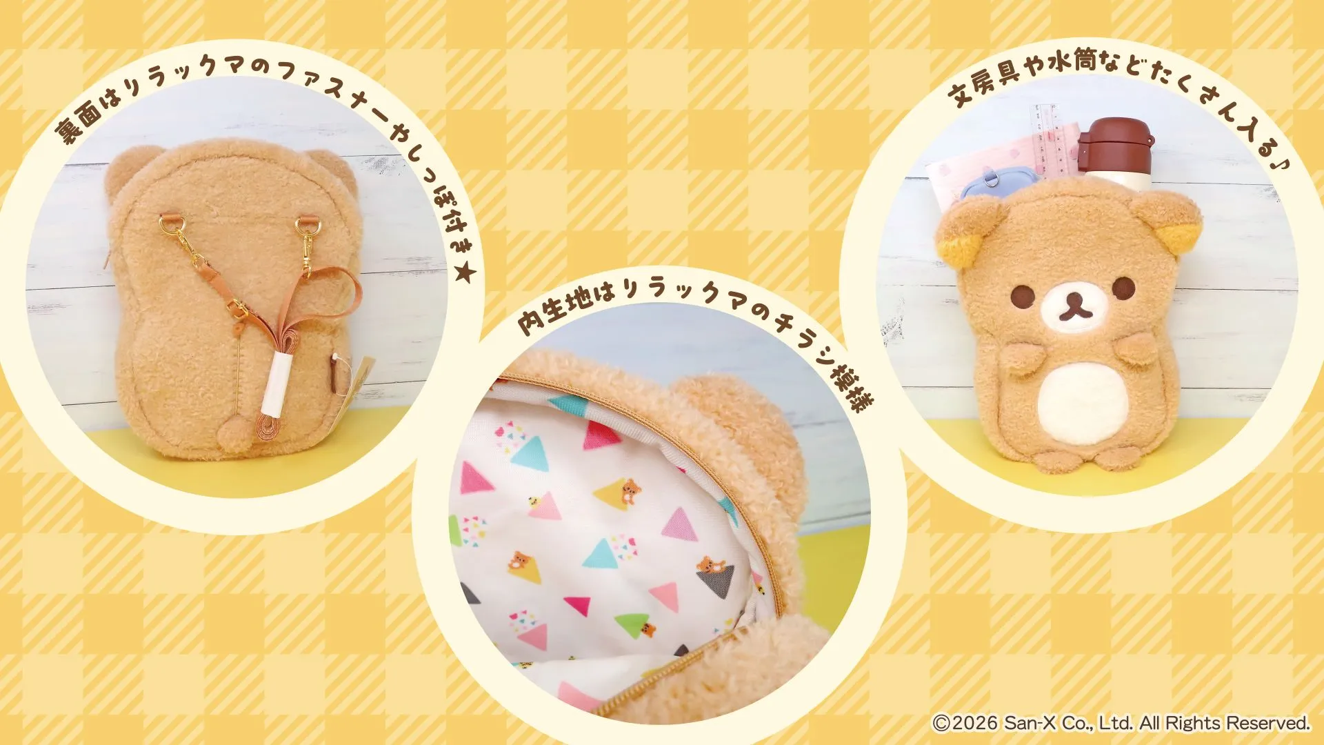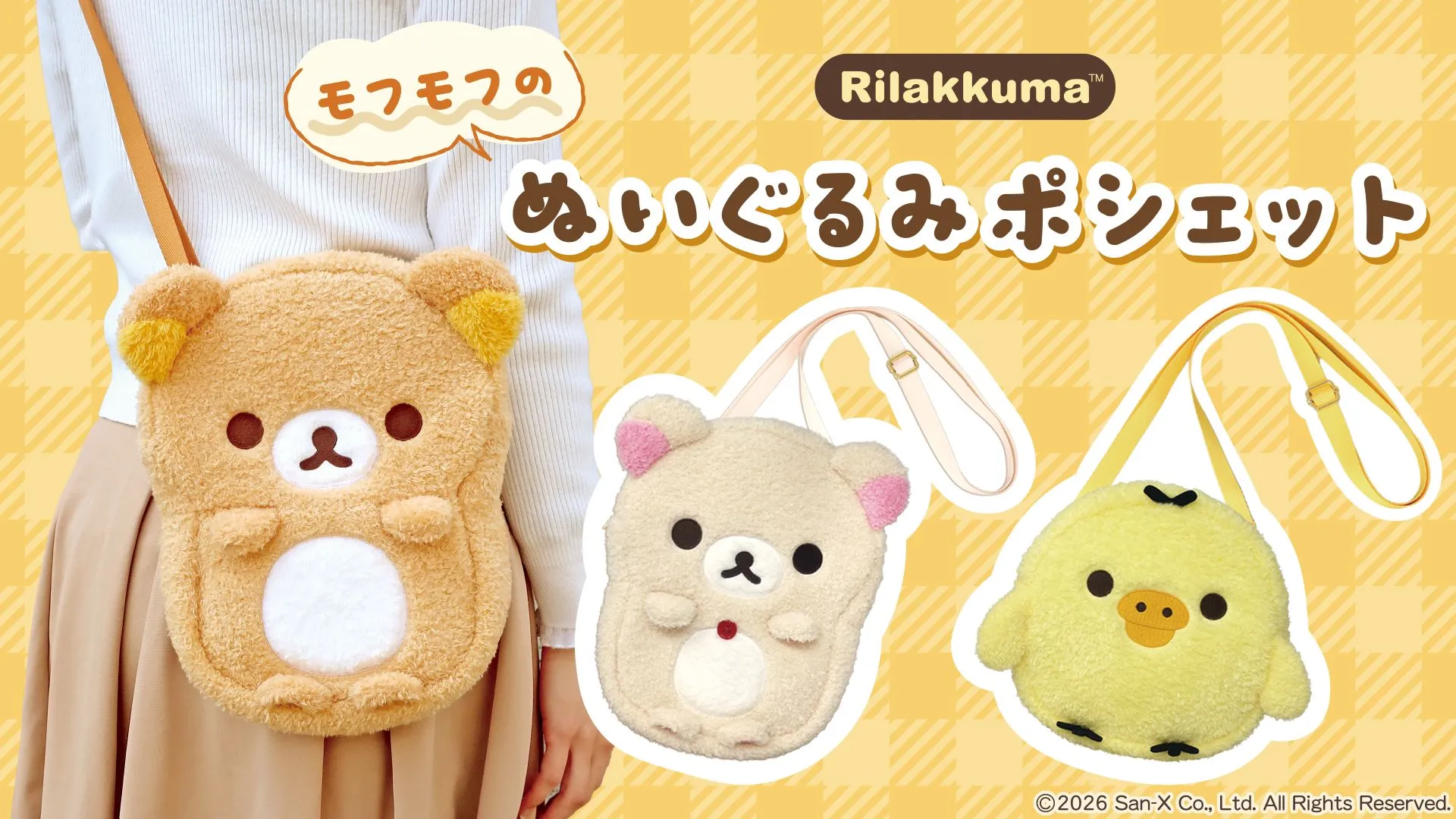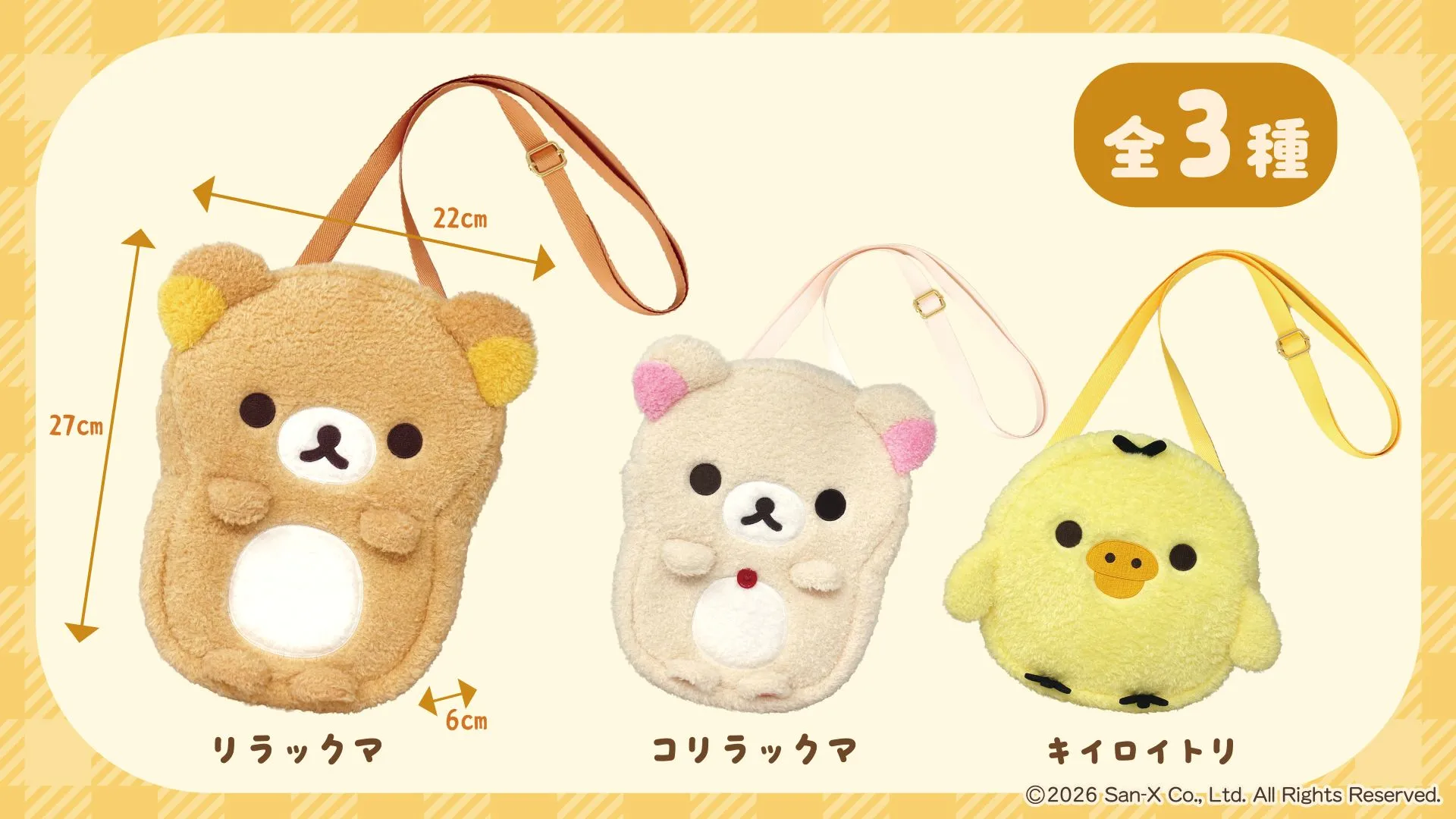 商品名:リラックマ ぬいぐるみポシェット 価格:各3,960円(税込) 種類:全3種(リラックマ・コリラックマ・キイロイトリ)