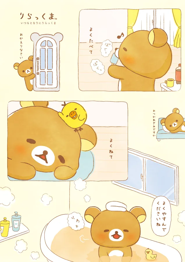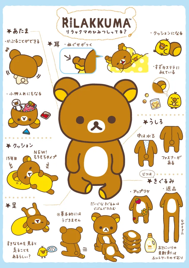 どこからともなくやってきた、白いクマの子。リラックマの知り合いではなかったようだけど、胸に赤いボタンがついているので、本物のクマではないみたい。コリラックマと名付けたのはキイロイトリ。