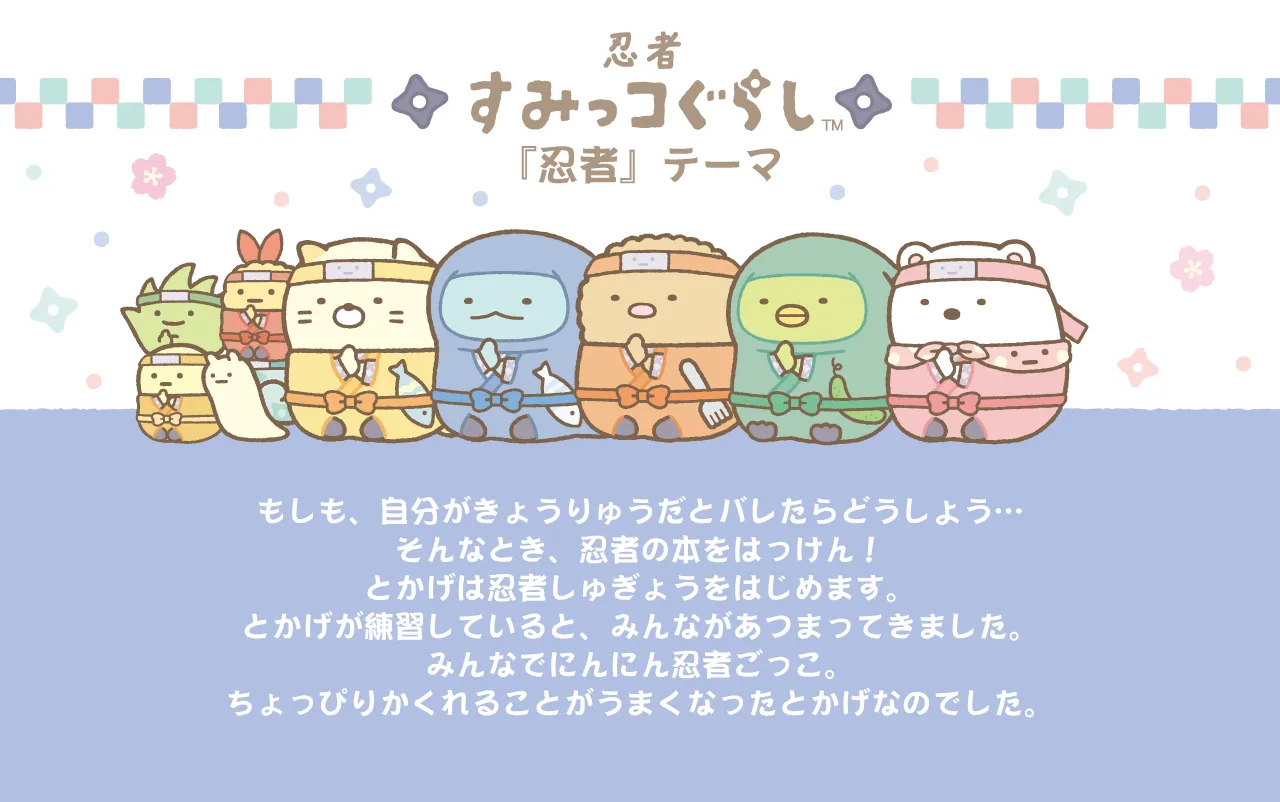 ※すみっコぐらし「忍者」は4月下旬より順次発売いたします。 ※掲載商品は、店舗によりお取り扱いのない場合や発売時期が異なる場合がございます。 ※数量限定のため、完売している可能性もございます。 ※発売日・デザイン・仕様は予告なく変更・中止となる場合がございます。 ※掲載画像は撮影用サンプル品を使用しているため、実際の商品とは異なる場合がございます。 ※オンラインショップでは、実店舗とお取り扱い商品・送料・購入条件が異なる場合がございます。あらかじめご了承ください。