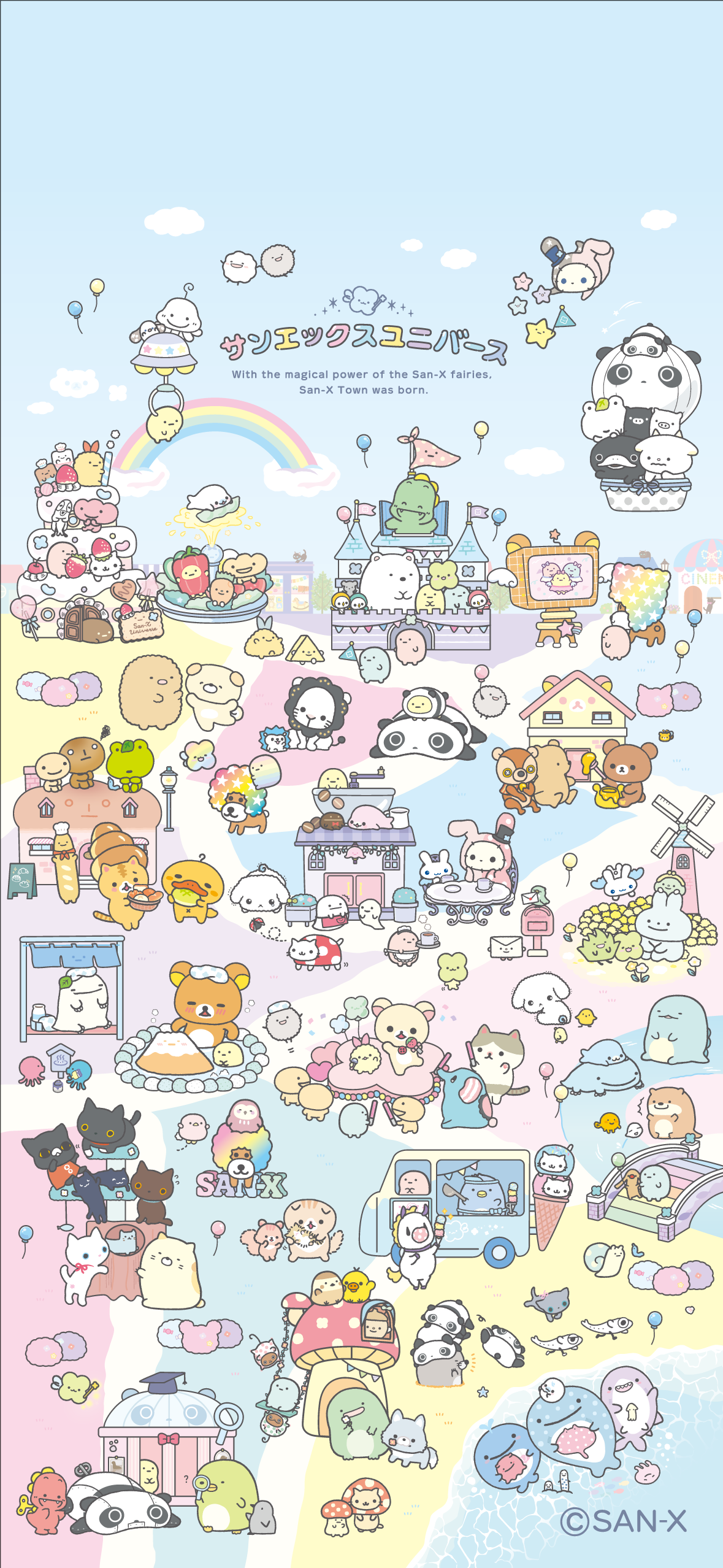 サンエックスのようせいの魔法の力で キャラクターがそれぞれの世界をこえて みんなが自分らしく暮らせる サンエックスタウンが誕生しました。