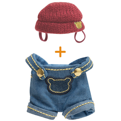 おでかけぬいぐるみキーホルダー(リラックマ)、うさぎのポンチョ、Tシャツ、オーバーオールのセットです。