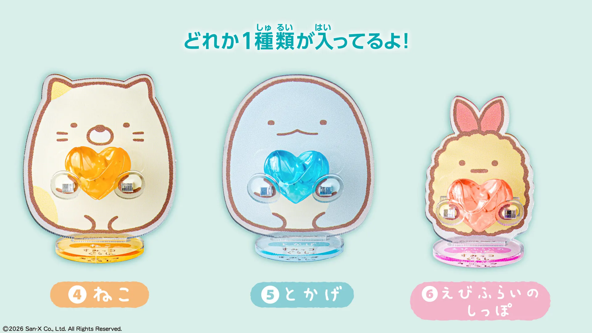 商品名称:Aku-Chara 角落小伙伴 价格:各1,408日元(含税) 类型:6种*本产品有百叶窗规格,因此您无法选择角色(颜色)。 发布日期:2026/4/11(星期六)